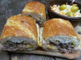 Сверху плотно прижать верхние половинки багета. Приятного аппетита!